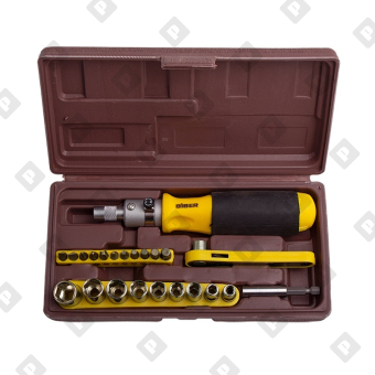Описание и особенности: Хром-ванадиевая сталь повышенной твердости. Обрезиненная эргономичная ручка с реверсивным механизмом. Набор из 23 предметов: торцевые головки - 5, 6, 7, 8, 9, 10, 11, 12; биты: плоский шлиц 5, 7 мм; крестовой шлиц #1, #2, #3; шестигранный шлиц #2, #3, #4, #5, #6; переходник; адаптер; плоская трещотка для бит.