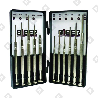 Описание и особенности: Лезвия изготовлены из углеродной стали S45C с полированным покрытием. Рукоятки покрыты никелем для стойкости к коррозии. Углеродистая сталь. Набор из 11 предметов: плоский шлиц - 0.9, 1.2, 1.4, 1.8, 2.4, 3.0; крестовой шлиц - #00, #0, #1; шило; магнит.