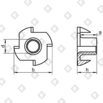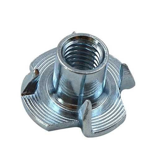 Гайка Т-образная имеет тонкий цилиндрический корпус и зубчатый фланец. Резьба - правая крупная метрическая для использования со стандартными крепежными изделиями. Устанавливается либо вручную путем осторожного вдавливания в подготовленное отверстие, либо с помощью молотка. При забивании ее зубцы врезаются в материал, обеспечивая тем самым крепкое стопорение, что полностью исключает проворот при вкручивании ответной детали.